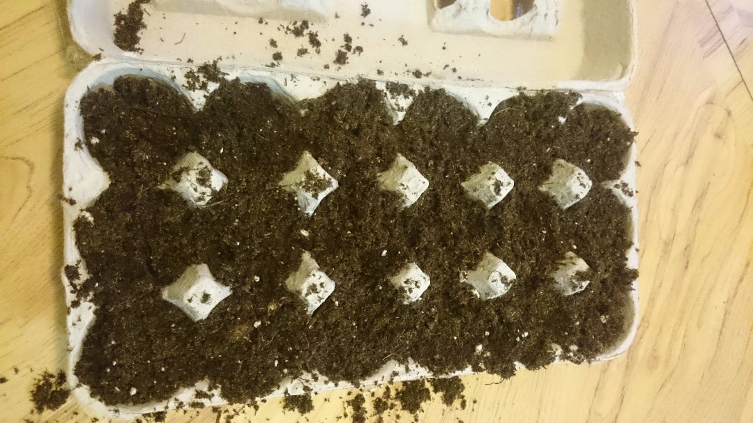 Add dirt to each dimple of the egg carton filling each dimple to the rim. Next moisten the seed-starting mix fill the pots with the mix and plant a.